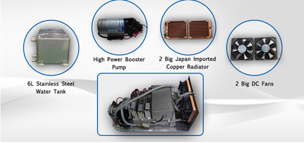 Water cooling: 6L big stainless steel water tank with a powerful booster pump, rather than magnetic pump,which is more powerful to guarantee perfect circulation of water.